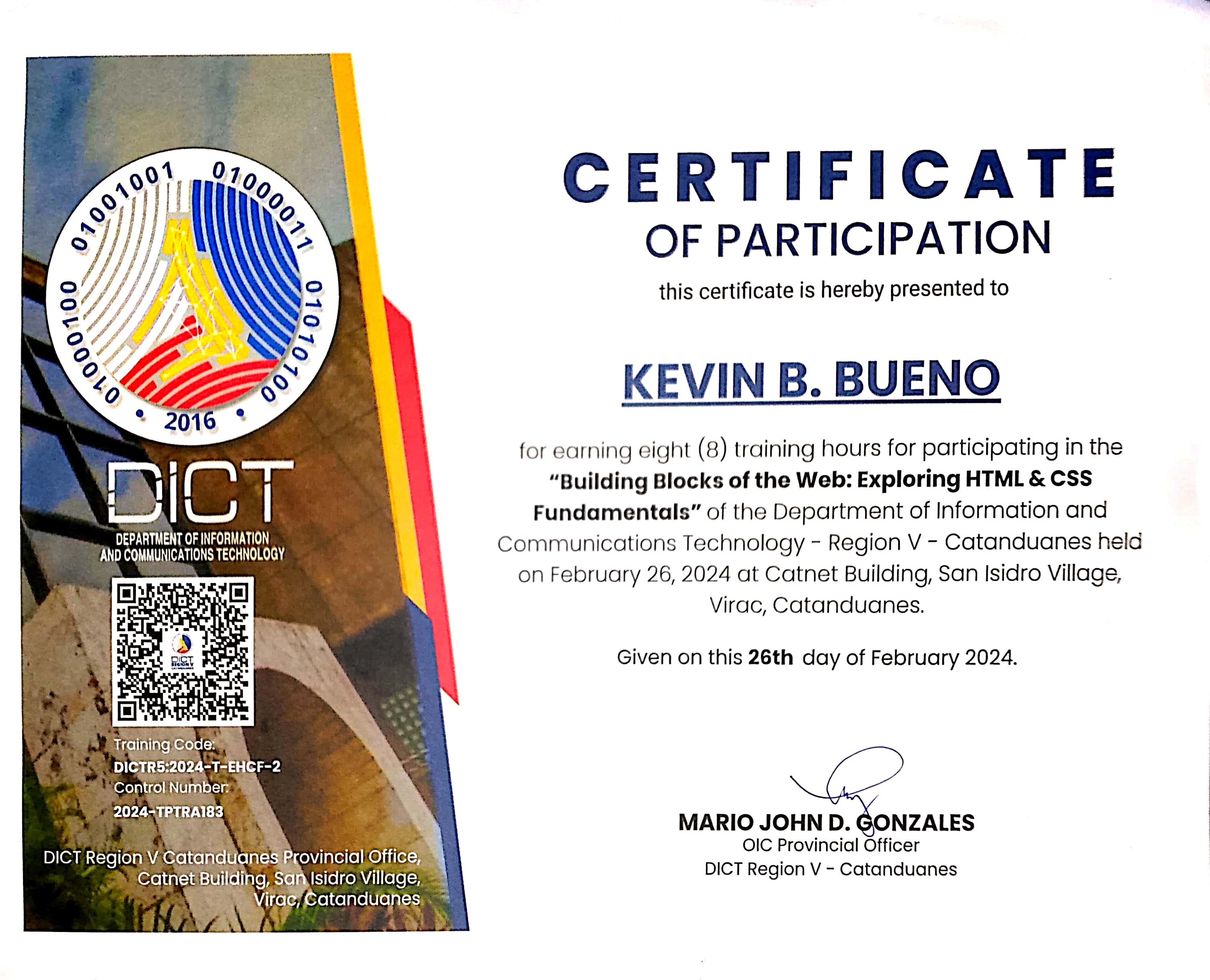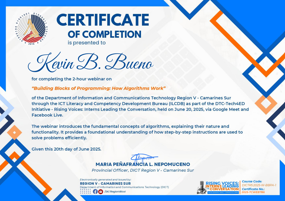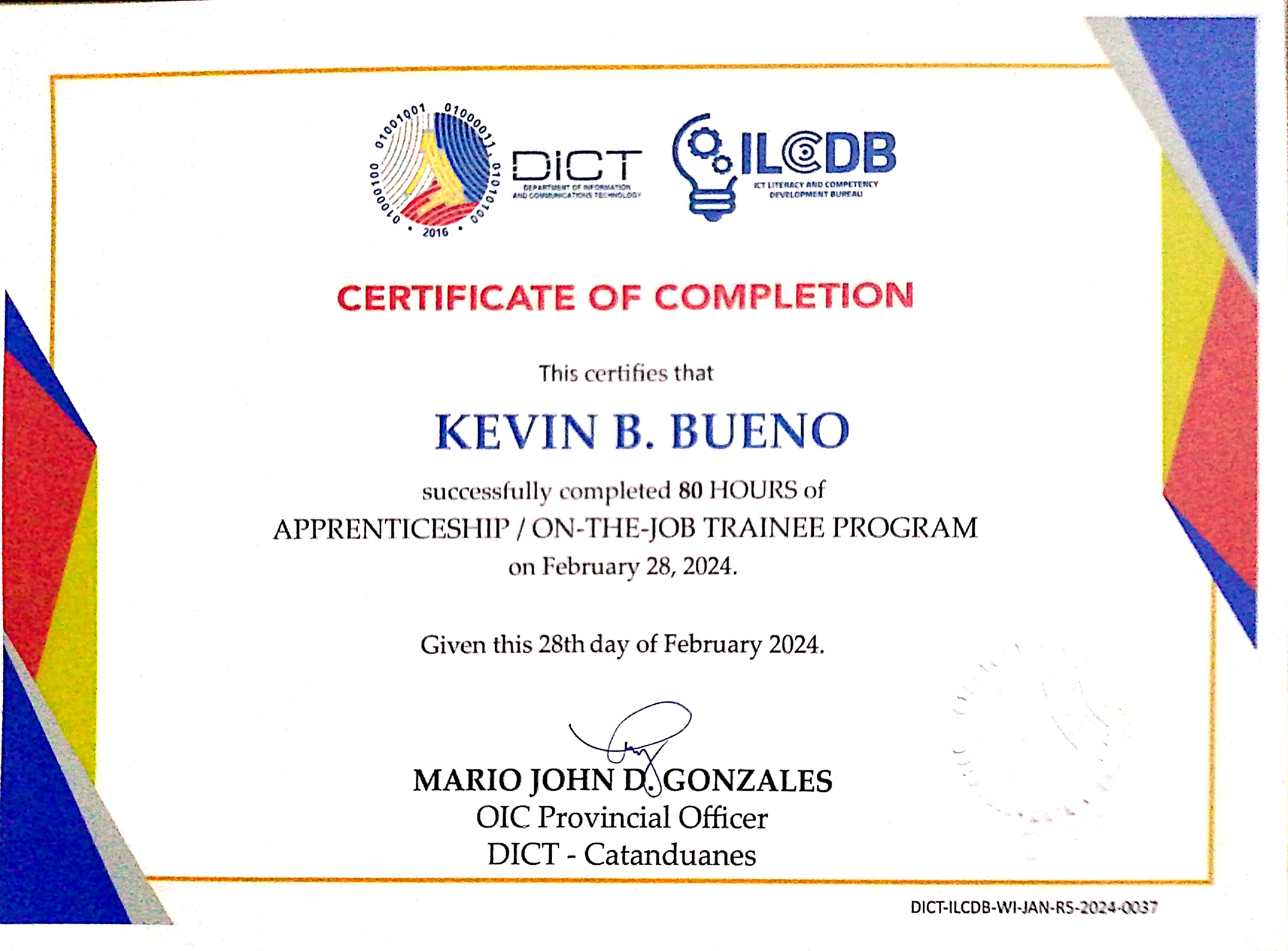 Successfully completed 80 hours of apprenticeship/ OJT Trainee program on DICT- Catanduanes. Had a great experience on attending different seminars and hands-on activities on different productivity tools such as Word, Excel, Photoshop, Windows 10 & Server installation, configuration, & client-server collaboration & explore the fundamentals of web (html & css). And collaborate with other interns and DICT officers.