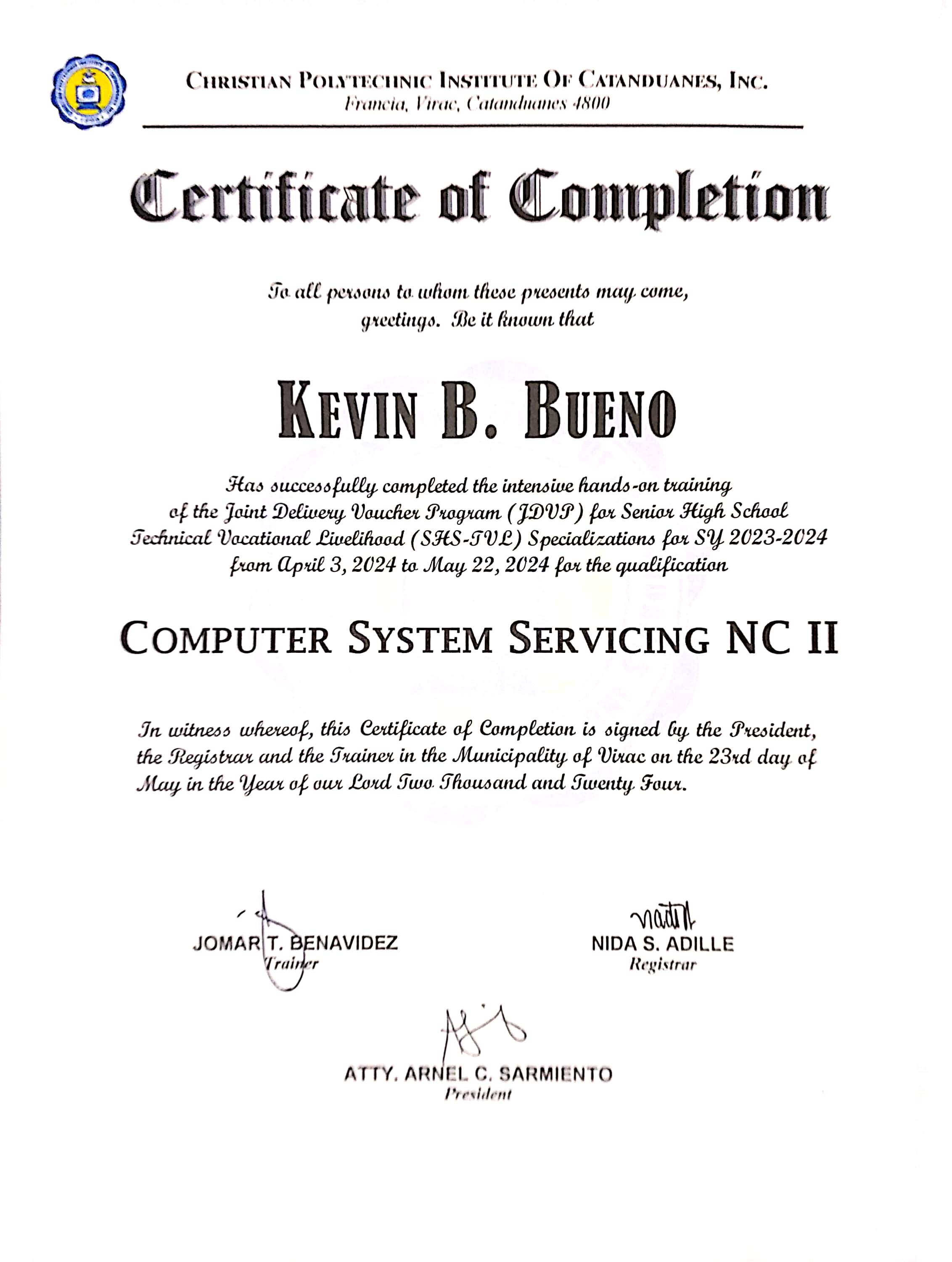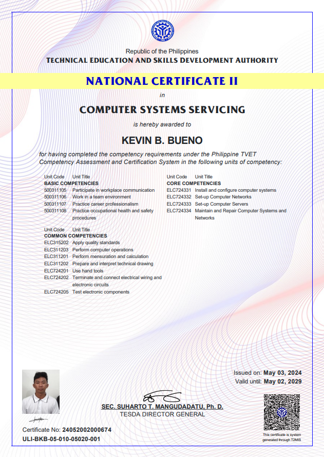 With High Honors, Computer Systems Servicing NCII passer, Outstanding Performance in Work Immersion, Outstanding Performance in Communication Arts English