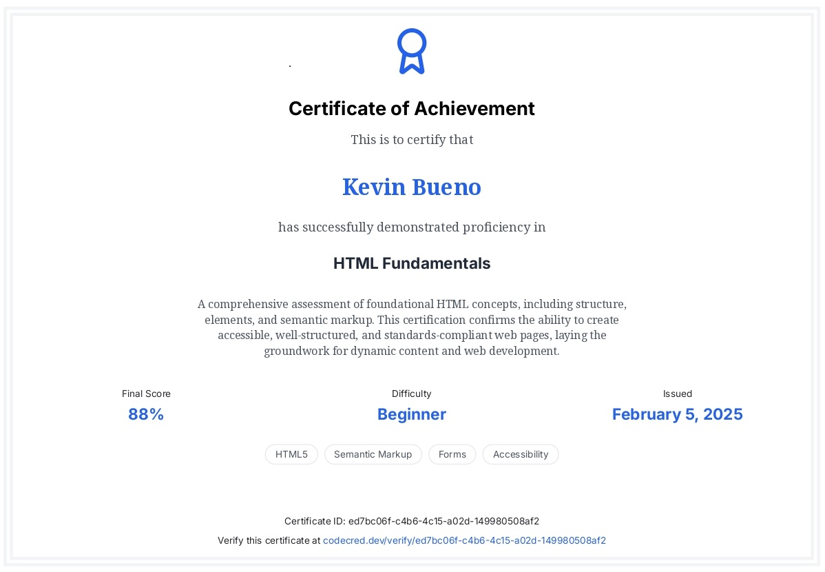 I'm Kevin Barias Bueno, a Computer Engineering student with a passion in software development and technology. I love creating innovative solutions and exploring new technologies. I'm a quick learner and a team player who is always eager to collaborate and learn from others.